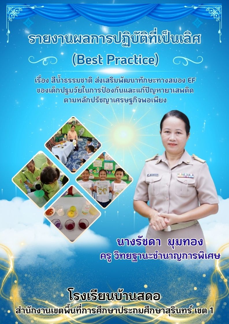 รายงานผลการปฏิบัติที่เป็นเลิศ (Best Practice ) เรื่อง สีน้ำธรรมชาติส่งเสริมพัฒนาทักษะทางสมอง EF ของเด็กปฐมวัย ในการป้องกันและแก้ปัญหายาเสพติด ตามหลักปรัชญาเศรษฐกิจพอเพียง